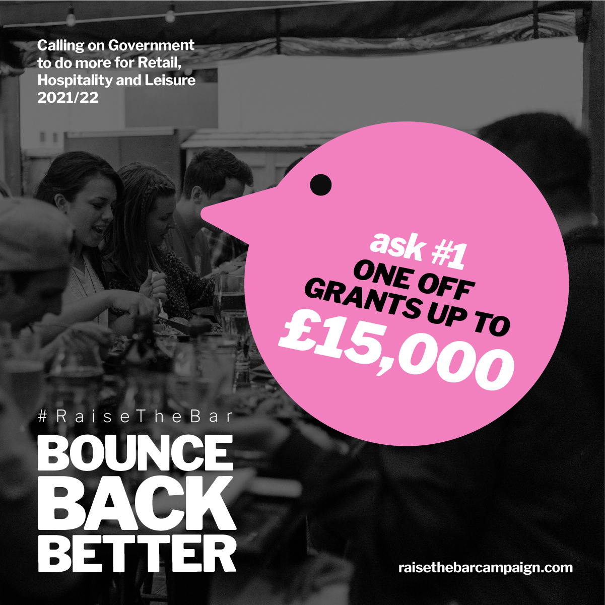 to provide a one-off ‘Bounce Back’ grant of up to £15,000 for retail, hospitality and leisure businesses in Tier 2 and Tier 3 across England and Wales with a rateable value of up to and including £150,000. This would support 137,000 businesses vital funds delivered in a manner Local Authorities are equipped to distribute at a total maximum cost of £2.05bn.