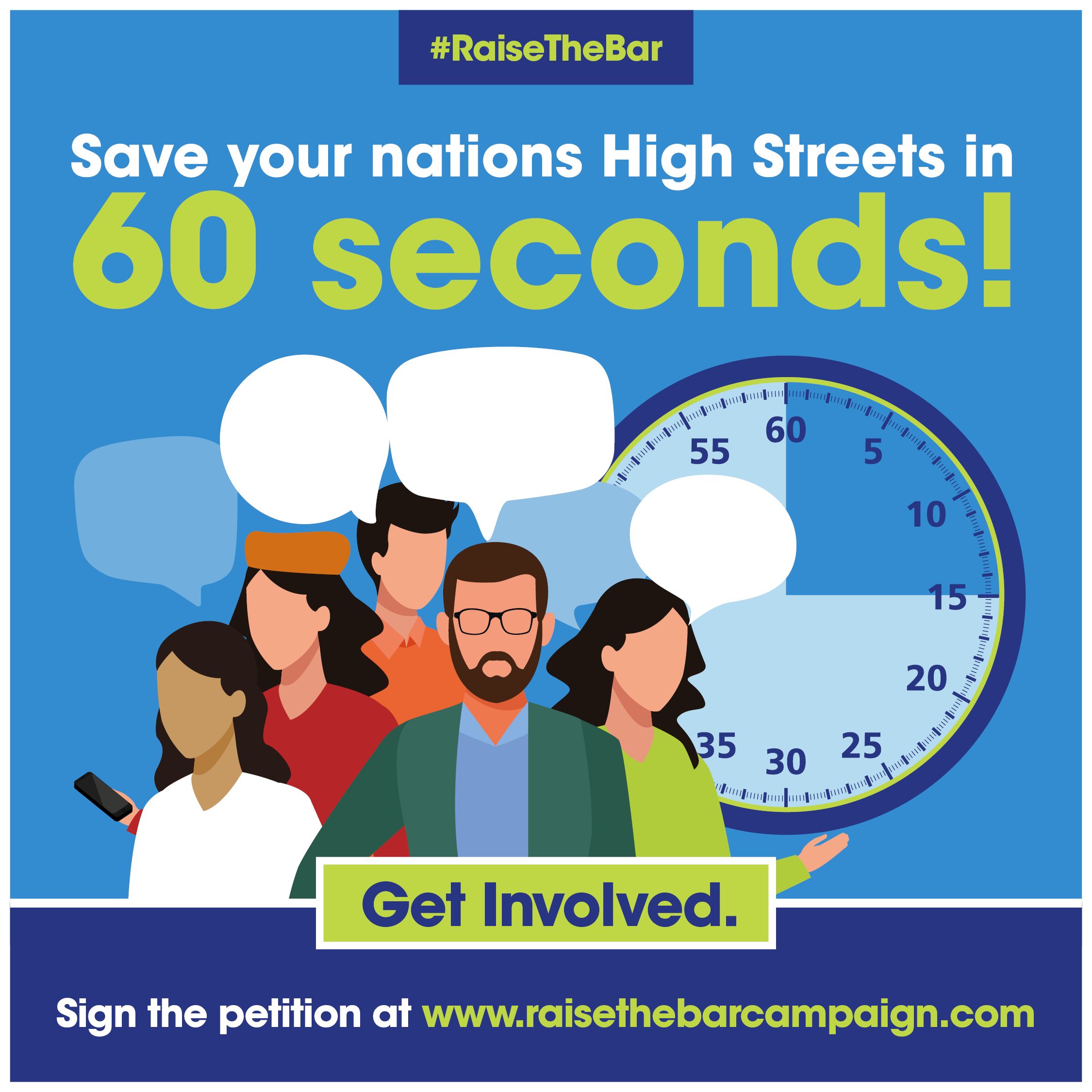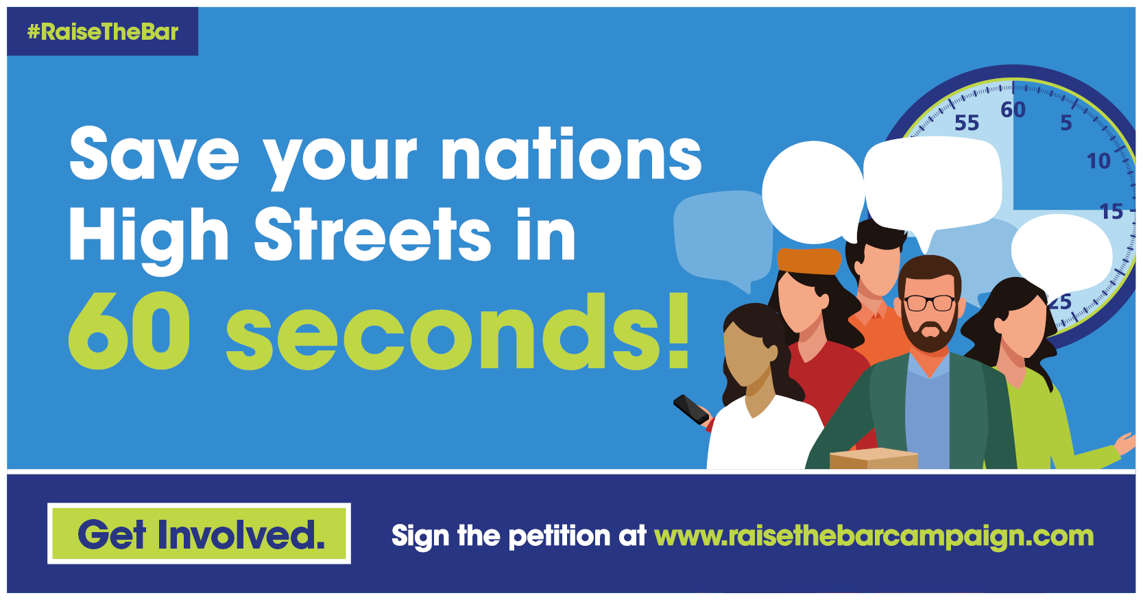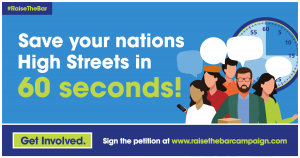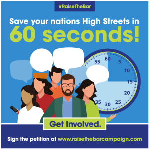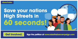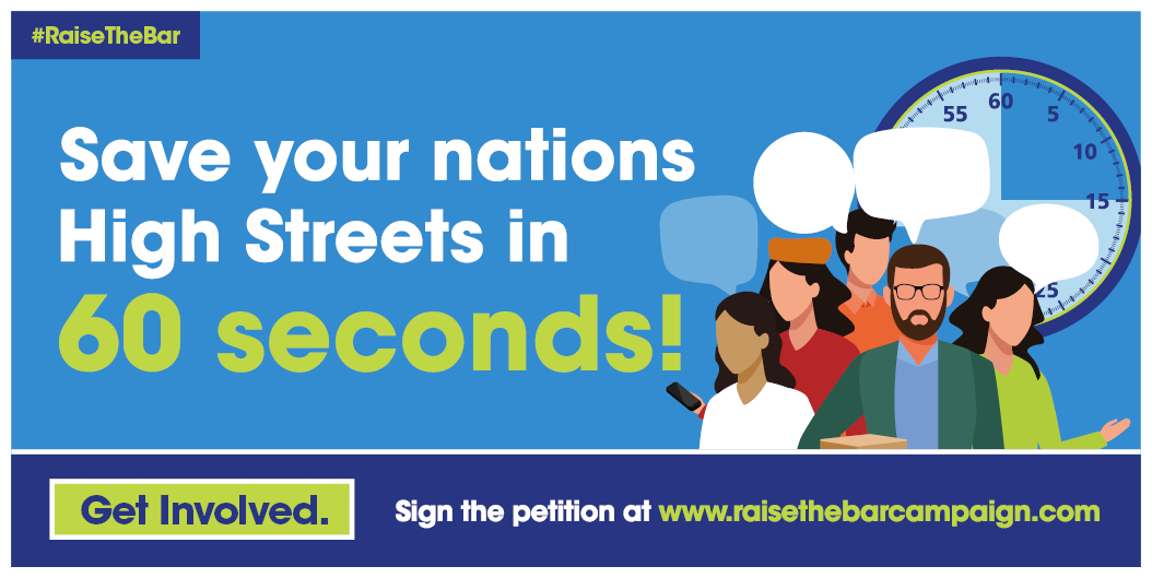 - 60 seconds to save the High Street and our communities – Sign-ups for the petition needs to increase. We have 6,000. Please use the attached ’60 seconds to save our high streets #RaiseTheBar creative and issue across all channels.