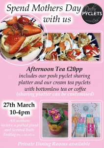 Afternoon tea £20pp – includes our posh pyclet sharing platter and our cream tea pyclets with bottomless tea or coffee .
